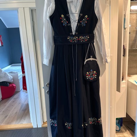 Isabell festdrakt mørk blå med broderinger og belte str 34/36. Den kan legges opp og legges ned etter behov. Nypris kr 1599,-