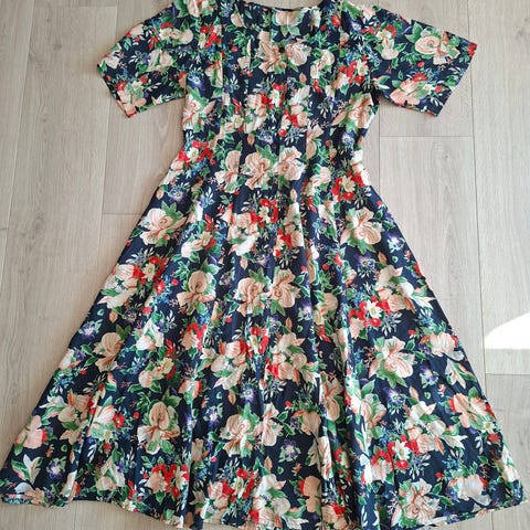 Nydelig sommerkjole fra Laura Ashley, med gule og blå blomster på en blå bakgrunn. Knapper hele veien ned fremme. Vidt skjørt med flott fall.