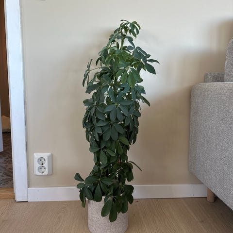 Grønn inneplante i potte. Planten står i en rund plastpotte med jord og har flere stengler med store, grønne blader. Egner seg som inneplante i stue, kontor eller andre oppholdsrom. Kan plasseres på gulv eller i plantekrok der det er naturlig lys. Krever jevnlig vanning og normal stell for potteplanter innendørs.
