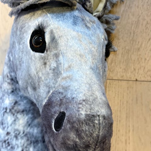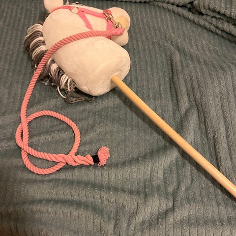 Le Mieux hobbyhest selges billig ettersom hodet er løst og snurrer på pinnen. Funker om man ikke har tenkt å bruke den veldig .