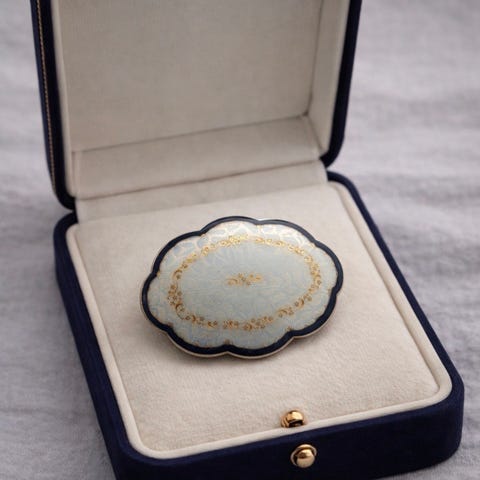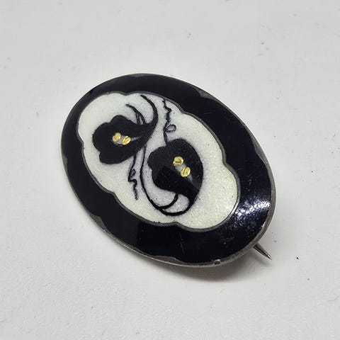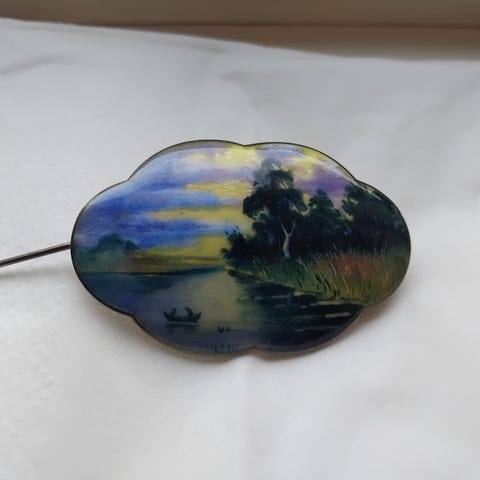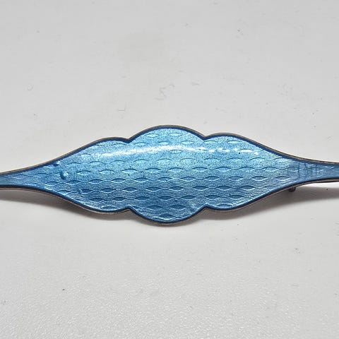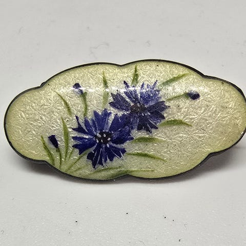 Emaljenål i sølv av Gustav Gaudernack - stempel G.G. 925 S N.M. Størrelse ca 7 cm i diameter. Nålen er hel og fin, men har noen bruksmerker i emaljen.