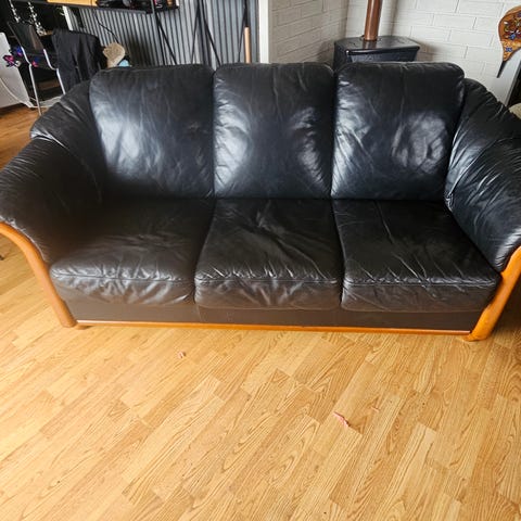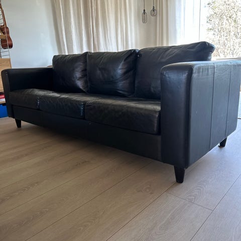 2 stk sofaer i sort skinn. Aner ikke merke men den er ikke fra Ikea. Hel og pen
