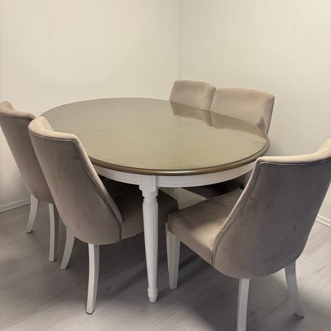 Selger et fint rundt spisebord med 5 tilhørende stoler. Bordet er hvitt og har en klassisk stil som passer godt i både moderne og tradisjonelle hjem. Stolene har lyse stoffseter med dekorativ tekst og gir et elegant preg.