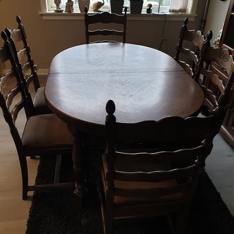 Litt sliten spisegruppe med bord og fire stoler gis bort