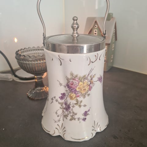 Eldre kjeksboks, håndmalt, trolig uraniumglass, sølvplett eller sølv lokk