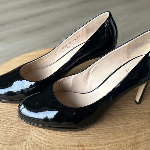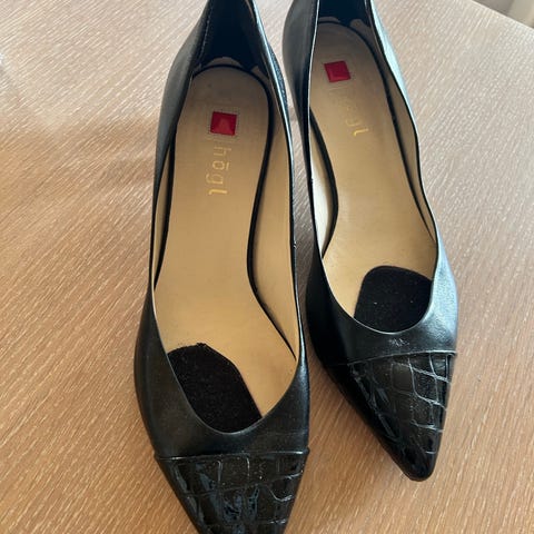 Högl hæler i størrelse 40. Skoene er i svart skinn med quiltet mønster på sidene og lakkdetaljer i front. Spiss tå og middels høy hæl. Foran har skoene en dekorativ lenkedetalj i metall. Modellen er egnet som damesko til bruk ved formelle anledninger, jobb eller penere hverdagsbruk.