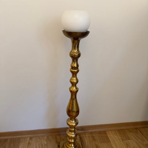To utrolig flotte og solide messinglysestaker. Tunge og stødige. Høyde: 59 cm og 48 cm. Noen små bruksmerker, men fremstår pene og i god stand. Selges samlet.