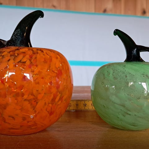 To vakre frukter i glass. Eple og gresskar (gresskaret i massivt glass).