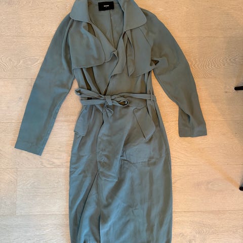 H&M kåpe for dame i størrelse S. Kåpen er grønn og laget hovedsakelig av polyester med noe ull i ytterstoffet, og har fôret innside i polyester. Modellen er en lang, rett kåpe med slag, knappelukking foran og splitt bak. Passer som yttertøy i overgangssesonger og milde vinterdager.