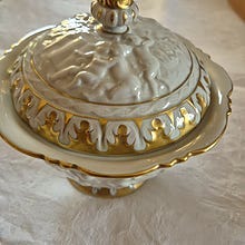 Dekorativ vase i porselen på fot med rikt relieff av blomster og frukt. Lokket har små åpninger som tyder at vasen kan brukes til potpourri. Fine detaljer med gullkant og fargerik blomsterdekor.