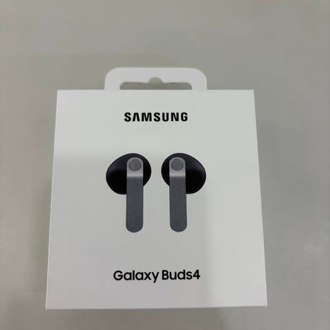 Pakken inneholder Galaxy Buds4-ørepropper og tilhørende ladeetui, slik det vises på bildene.