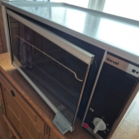 Gorenje bordkomfyr med integrert stekeovn og to elektriske kokeplater på toppen. Komfyren har frontåpning med glassdør, rist og stekebrett inni ovnsrommet. På høyre side sitter fire dreieknapper for innstilling av kokeplater, temperatur og funksjoner for ovnen. Enheten er beregnet for plassering på benk eller bord og kobles til vanlig stikkontakt. Egnet for enkle koke- og stekeoppgaver der det er begrenset plass, som hybel, hytte eller ekstra komfyr på kjøkkenet.
