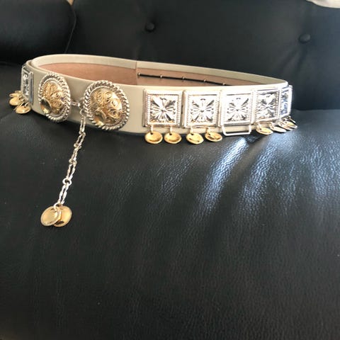 Lite brukt bunads belte i sølv og skinn belte. Er 90 cm langt, kan utvides til 100 cm. Følger med 7 ekstra beltestøler. Ny pris ca 23000.-