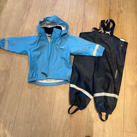 Didriksons regntøysett for barn i størrelse 92, unisex. Sett med jakke og selebukse i blå polyester. Jakken har hette og glidelås foran. Buksen har seler, forsterkede knær (hull på den ene forsterkningen, se bilde) og strikk nederst i bena. Refleksdetaljer på både jakke og bukse. Fint som yttertøy i vått og litt kaldt vær.