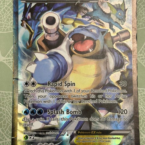 Pokémon Blastoise EX samlekort. Holografisk Pokémon-kort med Blastoise EX-motiv, egnet for samling og spill i Pokémon Trading Card Game. Viser angrep og kortinformasjon på engelsk trykk.
