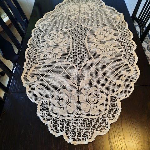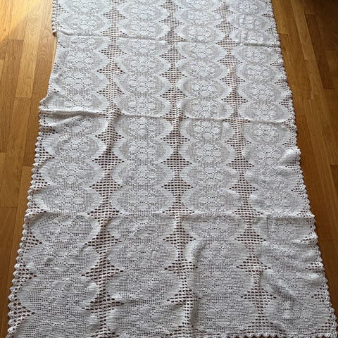 Heklet duk i hvit bomull med detaljert mønster av blomster og geometriske former. Duken har bølget kant rundt hele ytterkanten. Passer til bruk på bord eller kommode som dekorativ tekstil, eller sengeteppe som det var brukt til på vår hytte. Har ligget nedpakket og har ikke hatt hjerte til å selge dette før nå. Hadde vært hyggelig om noen andre får gleden av dette spesial bestilte håndarbeidet.