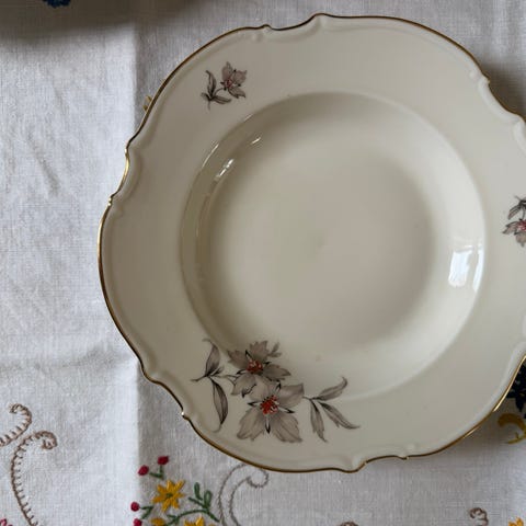 Servisesett i porselen bestående av flere tallerkener i ulike størrelser og én kopp. Delene er hvite med lyseblå kant og riflet, bølget mønster langs kanten. Noen av delene har gullkant. Settet kan brukes til servering av kaffe, te, kaker eller mindre måltider. Antall deler og eksakte mål fremgår av bildene.