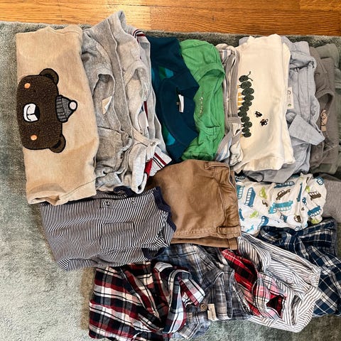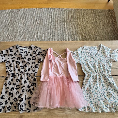 3 bukser, 2 tights, 2 gensere, 1 T-skjorte, 1 tynn genser og 1 softshell-jakke i vindtett og vanntett materiale.
