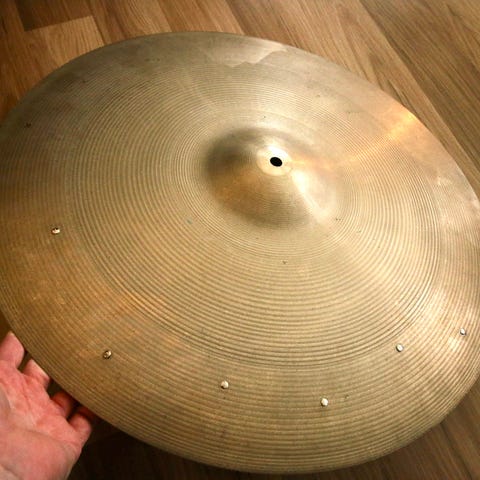 Cymbalen har en god del patina etter ca. 50 års bruk, men er ellers i god stand, og låter kjempefint. Det eneste som jeg kan se er en bitteliten antydning til «nøkkelhull».