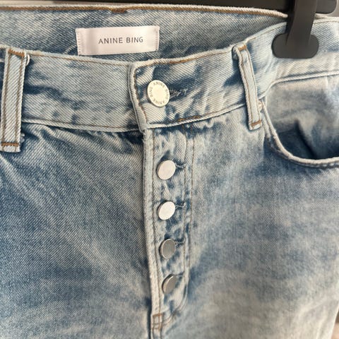 Anine Bing jeans bukse for dame i størrelse M med livvidde W27. Buksen er svart og laget i bomull. Klassisk 5-lommersmodell med knapp og glidelås i front. Stoffet fremstår som denim med lett vasket uttrykk. Passer til hverdagsbruk og kan kombineres med ulike topper og jakker.