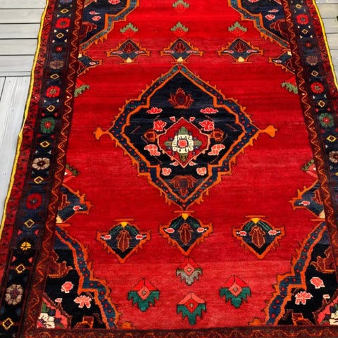 Iransk teppe i ull med tradisjonelt geometrisk og blomstrete mønster. Teppets hovedfarger er rødtoner og mørk blå, med detaljer i hvitt og andre kontrastfarger. Teppet er noe bleket av solen enkelte steder. Typisk orientalsk design og bord rundt kanten. Egner seg som gulvteppe i stue, gang eller andre oppholdsrom. Laget i Iran ifølge merkelapp.