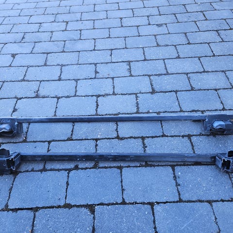 Takstativet består av to tverrstenger med festeføtter og integrert låsesystem. Nøkler til lås følger med, som vist på bildene. Stengene har profilert overflate og er beregnet for montering på bilens tak, for eksempel til transport av takboks, sykkelstativ eller annet takmontert utstyr.