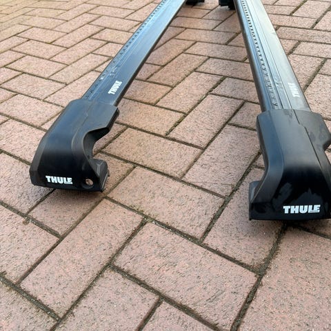 Eksakt lengde på stenger og hvilke bilmodeller stativet passer til er ikke spesifisert og bør kontrolleres mot Thules kompatibilitetsguide eller egen bil før bruk.