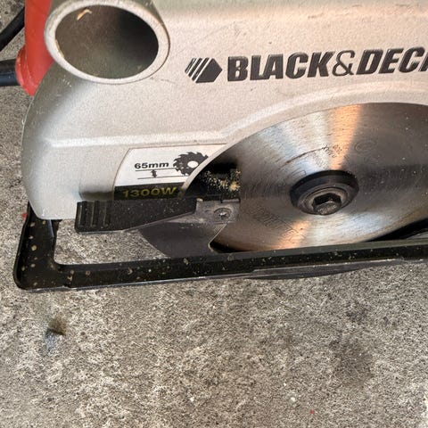 Black & Decker KS810 kapp- og gjærsag med 1050W motor. Saga har rundt sagblad montert på dreibar bordplate med graderingsskala for vinkelsnitt. Egner seg til kapping og gjæring av treverk og lignende materialer i verksted eller garasje. Strømtilkobling via ledning. Modellbetegnelsen KS810 og effekt på 1050W er oppgitt på maskinen.