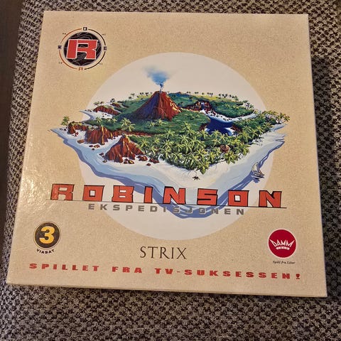 Robinson Ekspedisjon brettspill. Spillet er basert på TV-programmet og inneholder spillebrett, kort, brikker og terning slik det vises på bildene. Passer for 3 eller flere spillere, og går ut på å konkurrere på en øy med ulike utfordringer og poenggivning. Egner seg som familiespill eller til spillkvelder med venner.