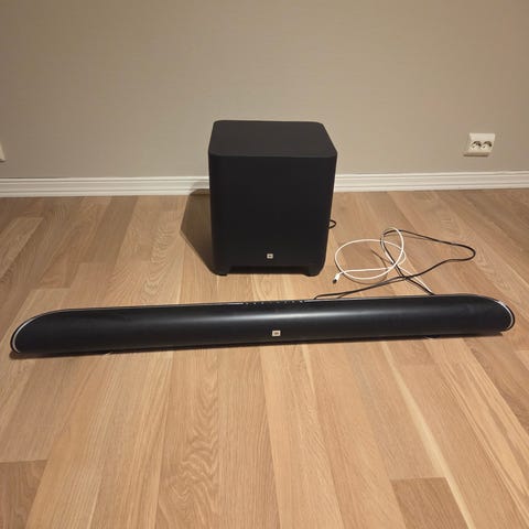 Denon DHT-S316 lydplanke med tilhørende trådløs subwoofer i svart. Systemet består av en slank lydplanke for plassering foran TV eller veggmontering, samt en separat subwoofer for dypere bass. Lydplanken har betjeningsknapper på toppen for volum og inngangsvalg. Subwooferen er trådløs til lydplanken. Egnet til bruk sammen med TV for forbedret lyd i stue eller TV-rom. Nødvendige kabler for tilkobling til strøm følger med etter det som vises på bildene. Øvrige tilkoblingsmuligheter og spesifikasjoner avhenger av den konkrete modellen.