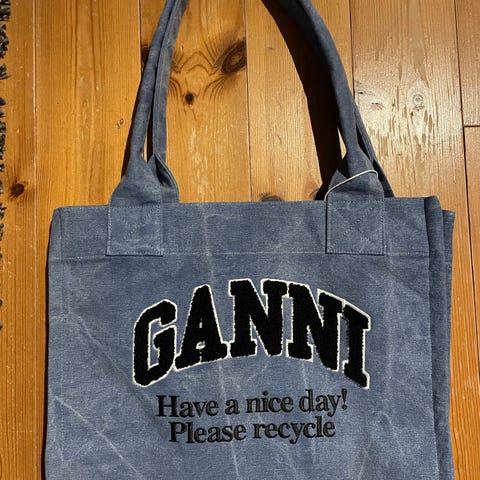 Ganni stoffveske for dame. Vesken er laget i tekstilmateriale med trykt mønster med ulike illustrasjoner og Ganni-logo. Modellen har to korte hanker for bæring i hånden eller over skulderen.Passer til hverdagsbruk, handling eller som ekstra veske på reise.