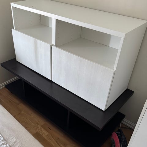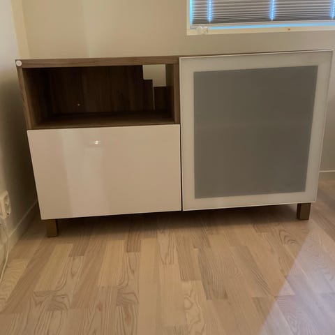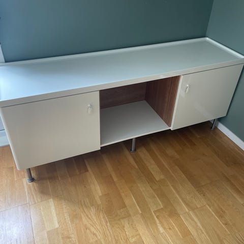 Pent brukt skjenk kan evt brukes som tv benk selges pga flytting. Den har to skuffer og to glass hyller. Kan leveres i Vestfold
