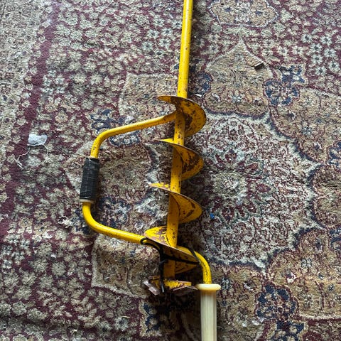 Manuelt isbor i blå farge. Boret har sveiv med to håndtak for enklere boring i is. Egnet til isfiske og andre aktiviteter der det er behov for å bore hull i islagte vann eller elver.