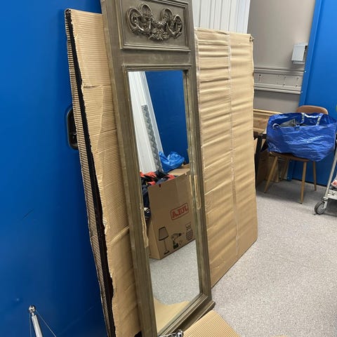 Utrolig vakkert og elegant fransk speil i fargen Gustaviansk blå og gullfargede detaljer. Mål B 86 cm x 92 cm. Speilet må hentes i Asker.