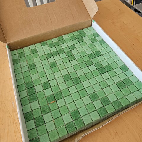Har to brett med mosaic à 5x5 cm, som utgjør et brett på 30x30 cm.