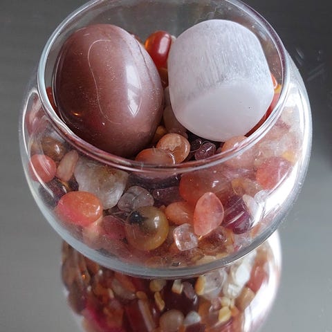 Krystall konfetti kjøpt hos kennas crystals vinteren 2023. Denne inneholder blant annet moseagat, rød jaspis og grønn aventurin tromlet stein, samt en mini fluoritt snømann. Denne mixen inneholder nelliker