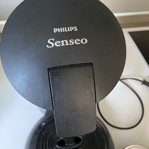 Philips Senseo kaffemaskin i hvit og svart utførelse. Maskinen er beregnet for bruk med Senseo-kaffeputer. Den har avtakbart dryppbrett og vannbeholder på baksiden. På siden finnes betjeningsknapper for én eller to kopper kaffe. Maskinen er egnet for plassering på kjøkkenbenk og til tilberedning av enkle kaffedrikker i hverdagen.