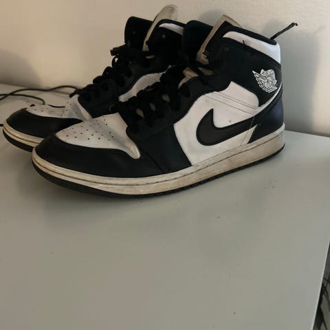 Nike Air Jordan 1 Mid sneakers i størrelse 42. Fargekombinasjon hvit og svart med grå detaljer, høy ankel og snøring. Overdel i syntetisk materiale og tekstil, perforert tåparti for ventilasjon og gummisåle med mønster for grep. Modellen har klassisk Air Jordan-logo på siden og tunge. Passer som fritidssko og hverdagsbruk. Har eske men er ødelagt. Selges fordi de er for små, men har brukt de veldig lite. Kjøpte for 1400.