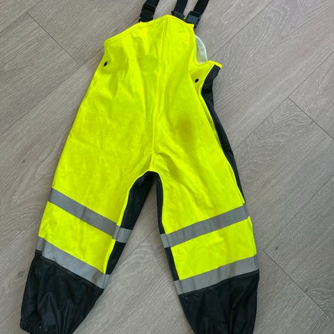 Svart regnbukse i god stand, men mangler strikk til under føttene.