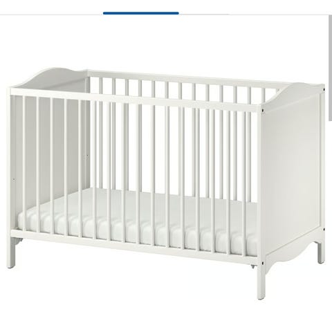 IKEA Gonatt sprinkelseng i hvit utførelse. Sengen har høye gavler og sprosser på langsidene. Nederst er det en romslig uttrekksskuff med tre knotter, egnet til oppbevaring av sengetøy, klær eller leker. Sengen kan tilpasses barnets behov ved at den ene langsiden kan tas av for å gjøre om sengen til en liten barneseng. Passer til standard madrass for sprinkelseng (mål ikke oppgitt). Egnet for baby og småbarn.