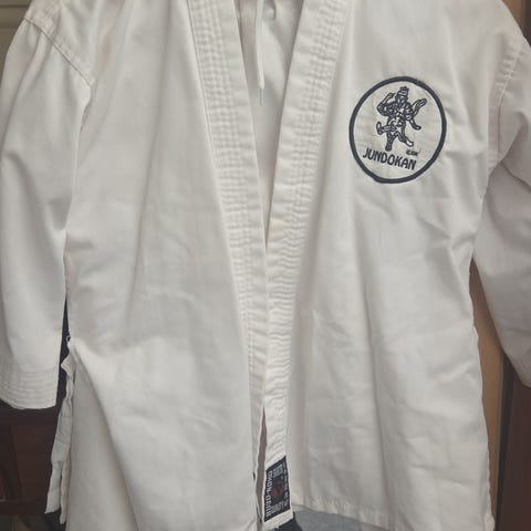 Karatedrakt unisex størrelse M i hvit farge. Sett med jakke og bukse, samt hvitt belte og beskyttelsesutstyr som vist på bildene. Drakten har tradisjonell omslagsjakke med brodert merke på brystet og bukse med strikk og snøring i livet. Egnet for karate eller lignende kampsporttrening for ungdom og voksne som bruker størrelse M.