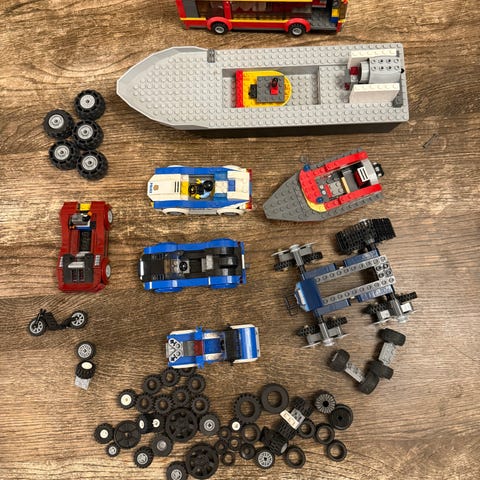 Diverse Lego- to biler med alle hjul på, to biler som mangler to hjul, et halvt helikopter, en båt, en minecraft-figur pluss div biter.