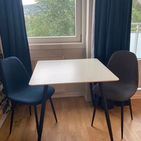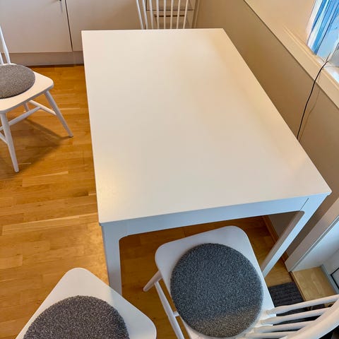 Bord med to stoler fra IKEA. Nypris 1 835 kr. Selges for 600 kr. Putene følger med.
