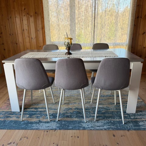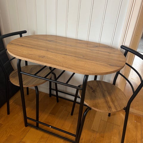 Selger ett spisebord og 2 stoler. Bordet er som på bildet utfoldet. Man kan også bruke det som ett vanlig firkantet bord.