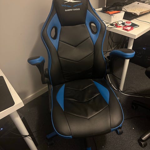 Stol, pult (115 cm x 74 cm og 77 cm høyt) , tastatur, matte og mus.