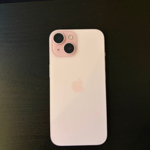 Selger iPhone 14 i hvit med rosa deksel og lader med støpsel.