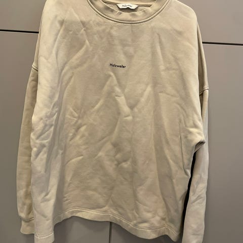 Holzweiler genser for herre i størrelse S. Genseren er hvit og laget av bomull. Den har rund hals og lange ermer. På forsiden er det diskret tekstdetalj, og på baksiden et større trykk med motiv i flere farger. Passer til hverdagsbruk og kan kombineres med både jeans og joggebukse.