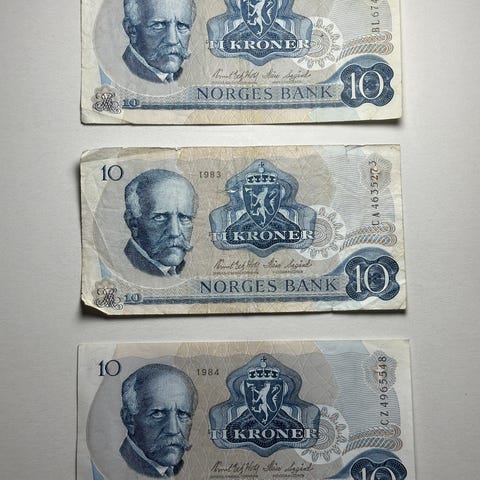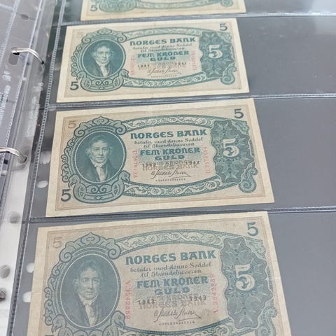 Samling med ulike utenlandske og norske sedler i album. Bildene viser blant annet eldre sedler fra Norge (Norges Bank 10 kroner), samt sedler fra flere andre land i ulike valører. Sedlene ligger i plastlommer i et ringperm-album. Egner seg for samlere av papirpengers historie og numismatikk. Antall sedler og eksakte årganger fremgår delvis av bildene.