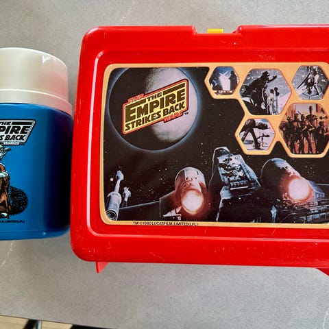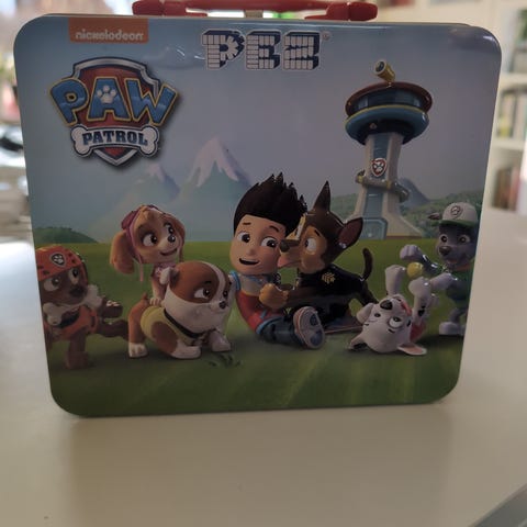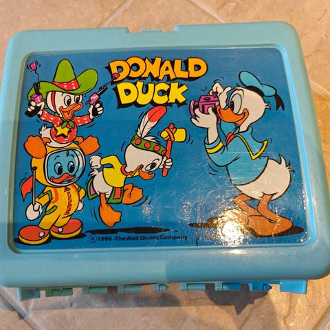 Design: Den har en blå base med et fargerikt lokk som viser karakterene i sirkulære rammer og en gul lukkemekanisme merket med "TOY".