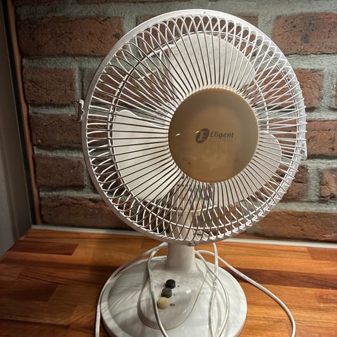 Tefal bordvifte i hvit farge. Viften har rund fot og beskyttelsesgitter i metall/plast rundt viftebladene. Den er beregnet for plassering på bord eller annen flat overflate og kobles til strøm med ledning. Egnet for bruk i rom der det er behov for enkel luftirkulasjon, for eksempel på kontor, soverom eller stue.